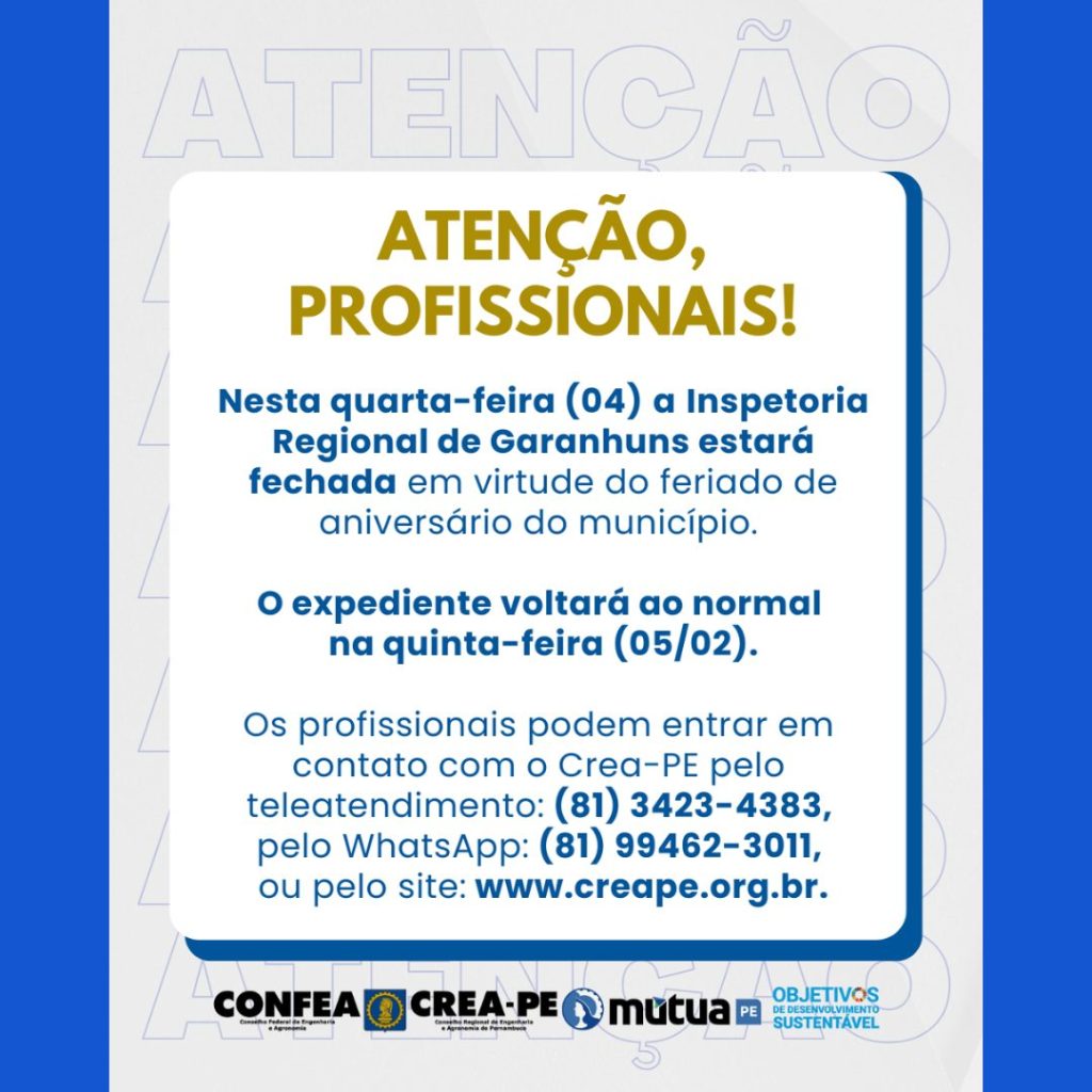 A Inspetoria Regional do Crea-PE em Garanhuns não irá funcionar nesta próxima quarta-feira, 04 de fevereiro,