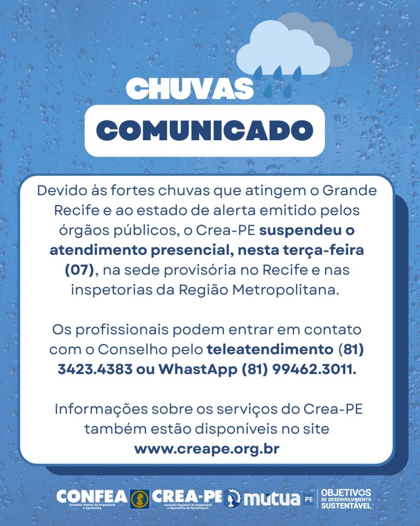 O Crea-PE informa que, em razão das fortes chuvas que atingem a Região Metropolitana do Recife, o atendimento presencial