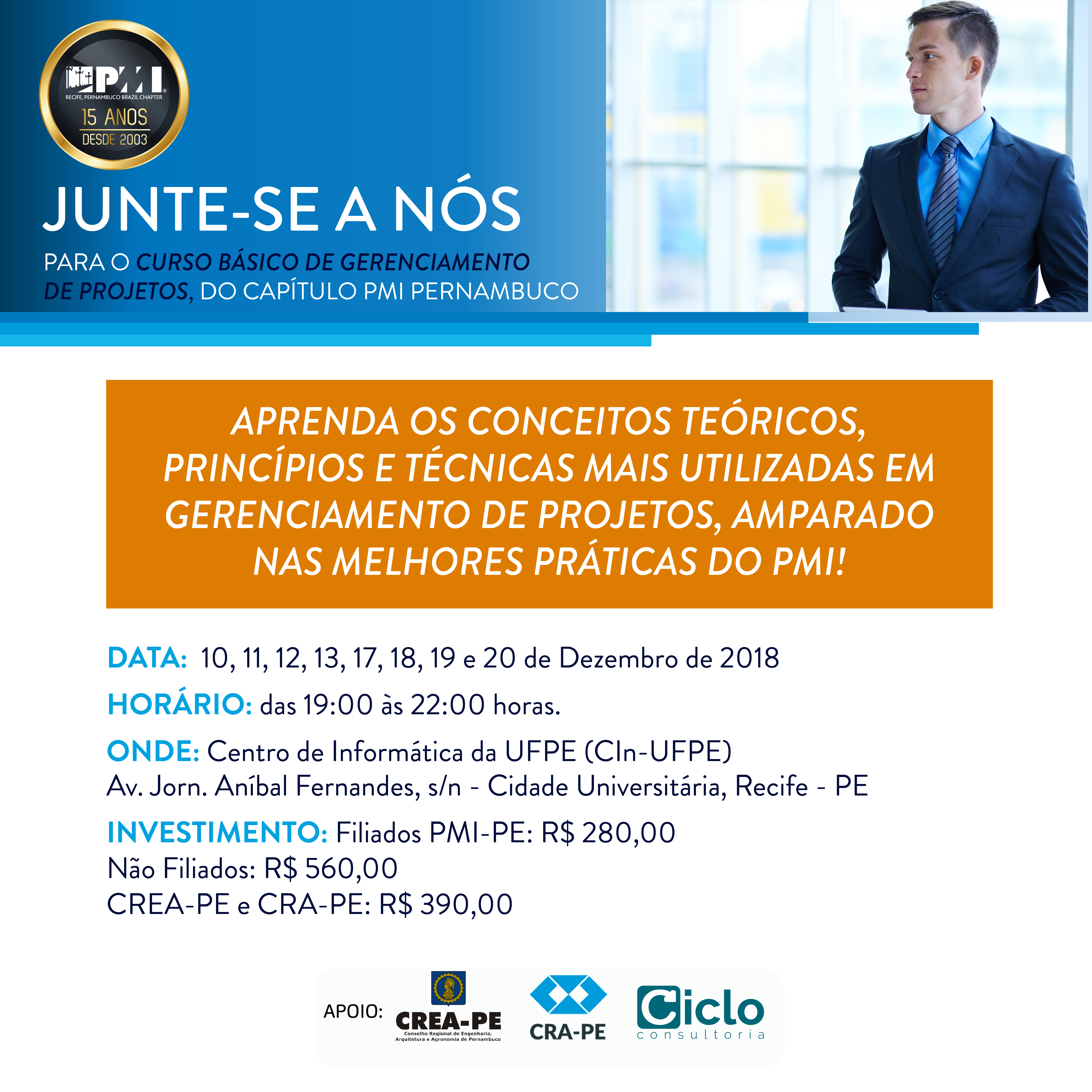 OBS: Para Filiados ao PMI-PE = R$ 280,00 (A inscrição está sujeita a validação posterior, mediante conferência dos dados de filiação informados).