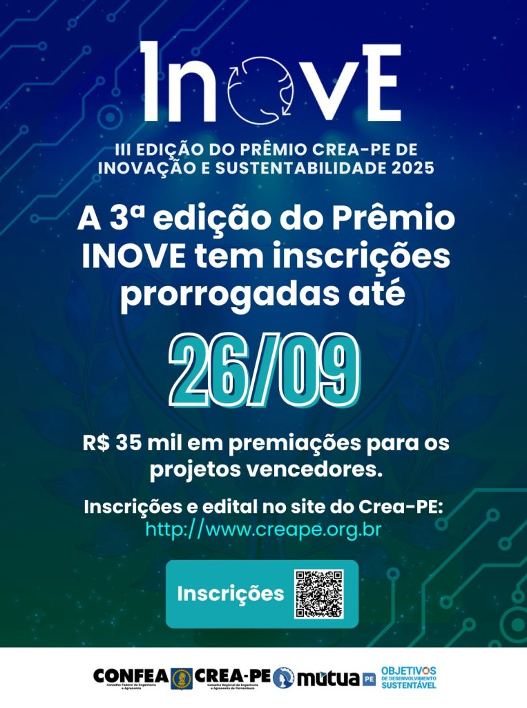 Também foram alterados os prazos de seleção, apresentação e definição dos finalistas O Prêmio Crea-PE de Inovação e Sustentabilidade da Engenharia, Agronomia e Geociências (INOVE) teve o prazo de inscrições...