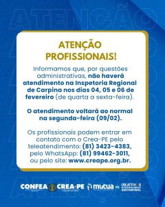 Os profissionais podem entrar em contato com o Crea-PE pelo teleatendimento: (81) 3423-4383, pelo WhatsApp: (81) 99462-3011, ou pelo site: www.creape.org.br.