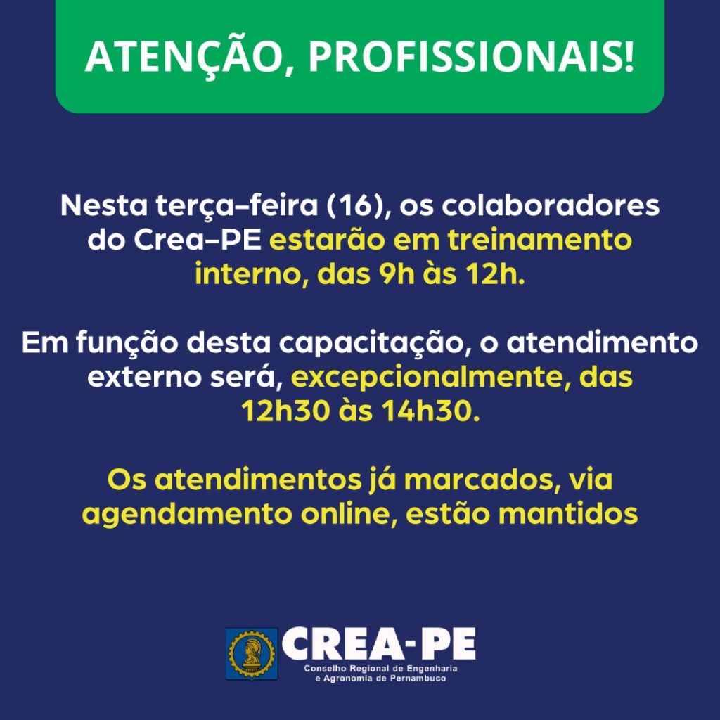 Um aviso aos profissionais do sistema Confea/Crea: nesta terça-feira (16), os colaboradores do Crea-PE estarão em treinamento interno, das 9h às 12h. Neste horário, não haverá atendimento externo em função desta capacitação. Excepcionalmente, o atendimento nesta terça-feira será das 12h30 às 14h30. Para os profissionais que agendaram atendimento para esta terça-feira, das 9h ao meio-dia, …