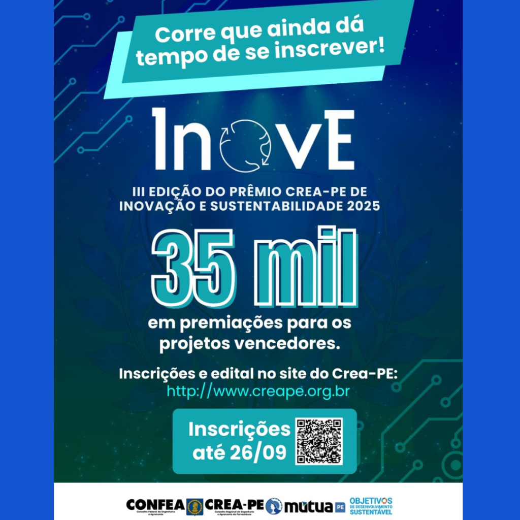Data limite é 10 de outubro e a premiação total é de R$ 35 mil e podem concorrer profissionais, entidades públicas, não governamentais e empresas de engenharia, agronomia e geociências de Pernambuco O Crea-PE está dando a última chance para empresas, entidades e profissionais participarem do Prêmio Crea-PE de Inovação e Sustentabilidade da Engenharia, Agronomia …