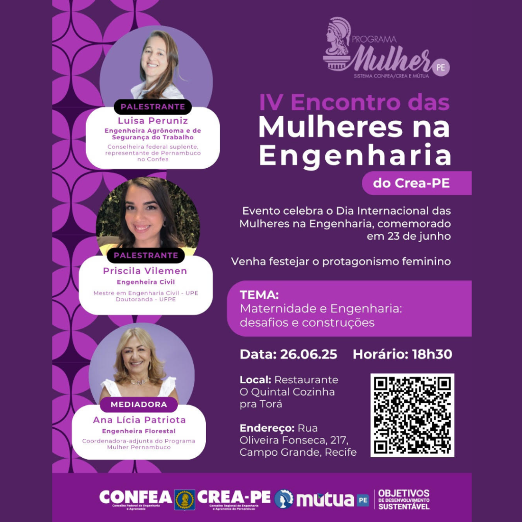 Evento acontece no próximo dia 26, no Restaurante Quintal Cozinha pra Torá, a partir das 18h30 Debater os desafios das profissionais engenheiras, agrônomas e geocientistas. Essa é a proposta de reflexão do IV Encontro das Mulheres na Engenharia do Crea-PE, na próxima quinta-feira (26). O evento promovido pelo Programa Mulher Pernambuco celebra o Dia Internacional …