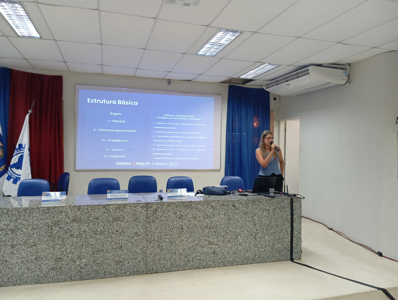 A programação da manhã teve início com a apresentação da superintendente técnica do Crea-PE, Liliana Ramos, e do secretário de Apoio ao Colegiado, Thiago Gomes, abordando o funcionamento do colegiado e a utilização do Sistema Virtual de Reuniões do Conselho (SITAC). No período da tarde, a gerente de Fiscalização do Crea-PE, Denise Maia, iniciou às exposições tratando do planejamento das ações de fiscalização no estado.