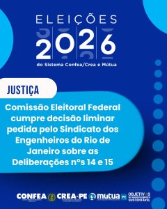 A Comissão Eleitoral Federal do Conselho Federal de Engenharia e Agronomia acatou a decisão liminar pedida pelo Sindicato dos Engenheiros do Rio de Janeiro. A decisão judicial urgente foi concedida por um juiz de Brasília, no dia 1º de abril de 2026, e determinou a suspensão imediata de duas decisões anteriores da Comissão (as Deliberações 14 e 15 de 2026). Com isso, todos os itens destas decisões estão suspensos. Tais deliberações tratam de regras de desincompatibilização dos candidatos aos cargos da eleição de 2026. Elas podem ser consultadas nestes links: Deliberação nº 14 e Deliberação nº 15.