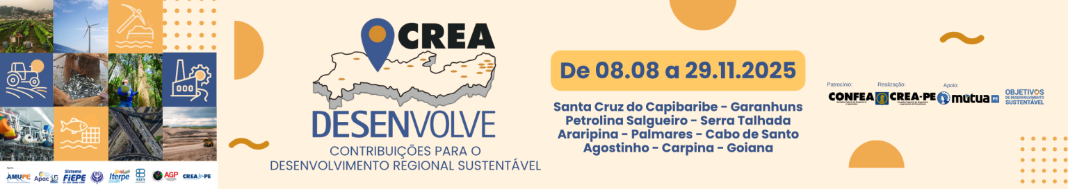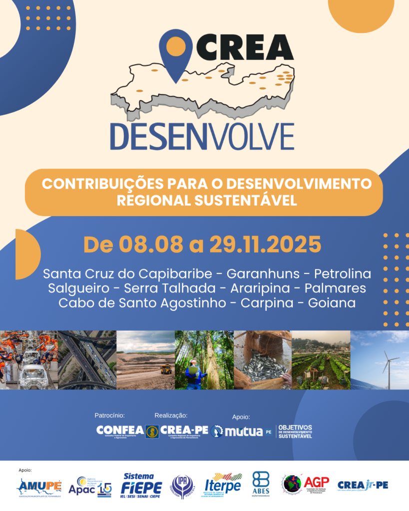 É uma iniciativa do Crea-PE, em parceria com a ABES-PE e a AGP. O objetivo é debater os desafios e encontrar soluções para o desenvolvimento dos polos econômicos, em todas as regiões do Estado, através das Engenharias, da Agronomia e das Geociências.