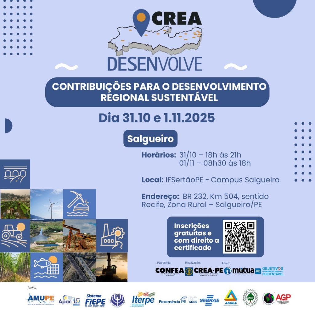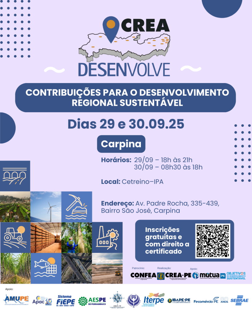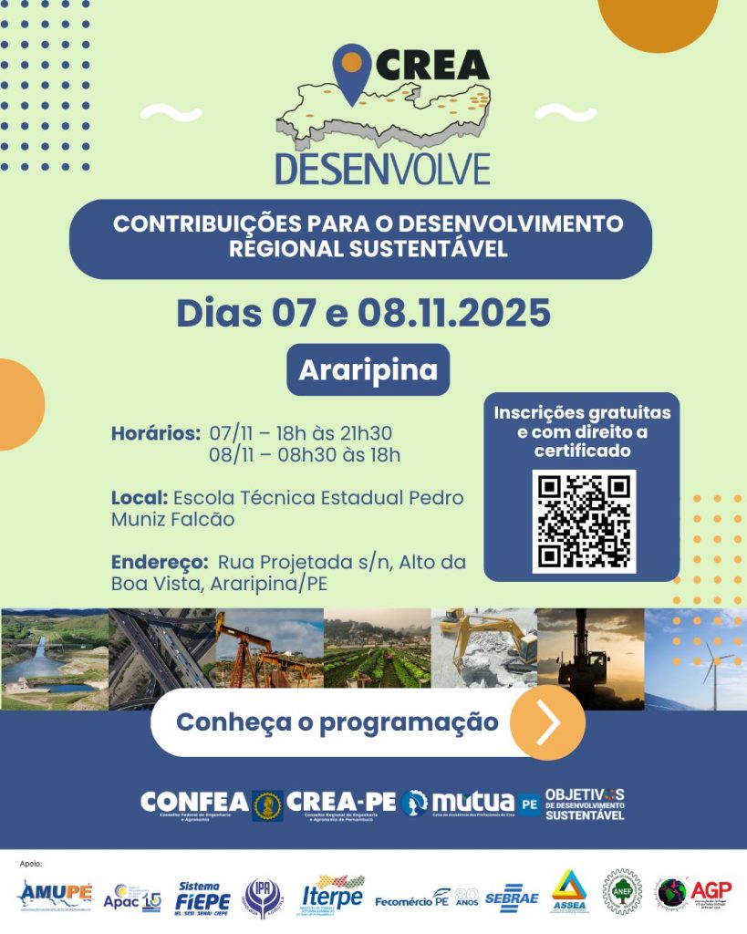 Evento tem inscrição gratuita neste link e é voltado para os profissionais do sistema Confea/Crea, gestores público, iniciativa privada, instituições de ensino, entidades de classe, com certificado de participação Garanhuns...