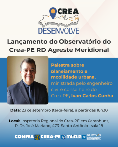A cidade de Garanhuns passará a contar com um espaço de debates e diagnósticos para fortalecer o planejamento urbano e apoiar municípios, empresas e profissionais da região. No dia 23 de setembro, será lançado o Observatório do Crea-PE para a Região do Agreste Meridional. A programação contará com uma palestra sobre planejamento e mobilidade urbana, ministrada pelo engenheiro civil e conselheiro do Crea-PE, Ivan Carlos Cunha.