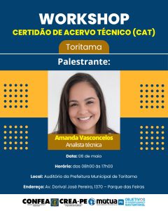 A capacitação vai ser realizada na cidade de Toritama e será conduzida pela analista técnica do Crea-PE, Amanda Kerle. A atividade acontecerá no auditório da Prefeitura Municipal, localizado na Av. Dorival José Pereira, nº 1370, Parque das Feiras, das 8h00 às 17h00.