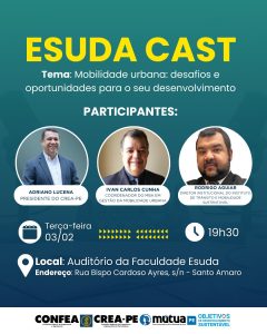 Os desafios e as soluções de mobilidade urbana serão assunto do bate-papo do Esuda Cast, no dia 03 de fevereiro, que vai contar com a participação do presidente do Crea-PE, Adriano Lucena. O podcast será realizado no auditório da Faculdade Esuda, na Rua Bispo Cardoso Ayres, S/N, Santo Amaro, às 19h30.