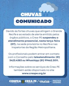 O Crea-PE informa que, em razão das fortes chuvas que atingem a Região Metropolitana do Recife, o atendimento presencial está suspenso nesta terça-feira (7), tanto na sede provisória quanto nas inspetorias da RMR.