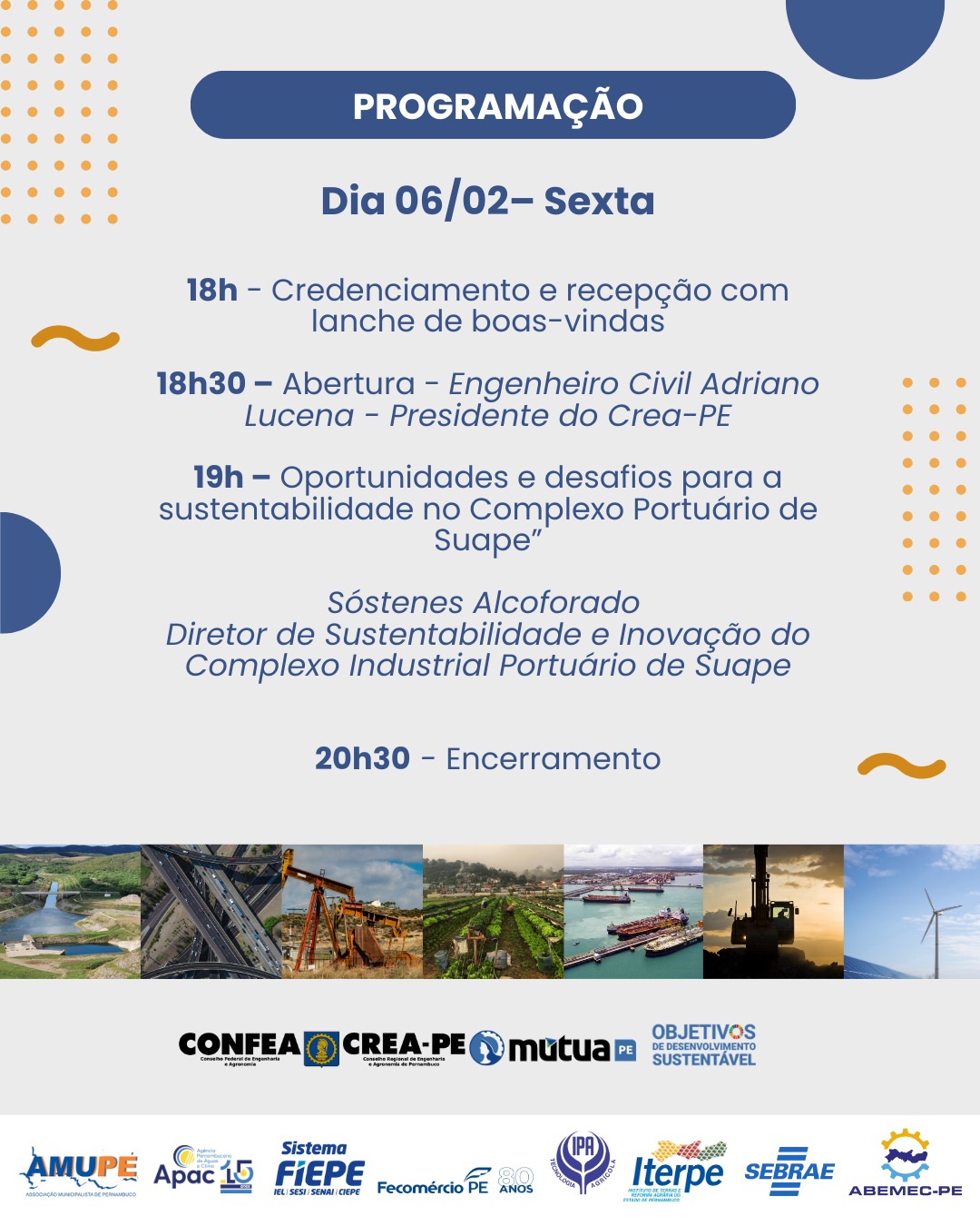 O desenvolvimento sustentável do Cabo de Santo Agostinho e região será o foco das palestras do Seminário Crea Desenvolve, nos dias 06 e 07 de fevereiro. O evento terá início na sexta, às 18h, com o credenciamento, seguido da abertura pelo presidente do Crea-PE, Adriano Lucena. Em seguida, o diretor de Sustentabilidade e Inovação do Complexo Industrial Portuário de Suape, Sóstenes Alcoforado, aborda o tema: “Cabo de Santo Agostinho: porto, indústria, turismo e participação social – rota para um desenvolvimento sustentável”.