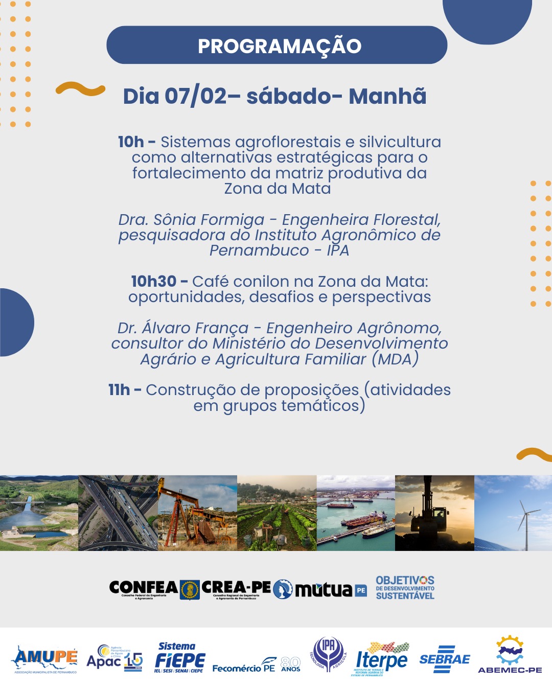 O geógrafo Arthur Albuquerque ministra a palestra sobre “Planejamento: base para o desenvolvimento dos municípios”. A engenheira florestal e pesquisadora do IPA Sônia Formiga fala sobre “Sistemas agroflorestais e silvicultura como alternativas estratégicas para o fortalecimento da matriz produtiva da Zona da Mata”. Finalizando a programação das palestras, o engenheiro agrônomo Álvaro França, do Ministério do Desenvolvimento Agrário, apresenta a temática “Café conilon na Zona da Mata: oportunidades, desafios e perspectivas”.