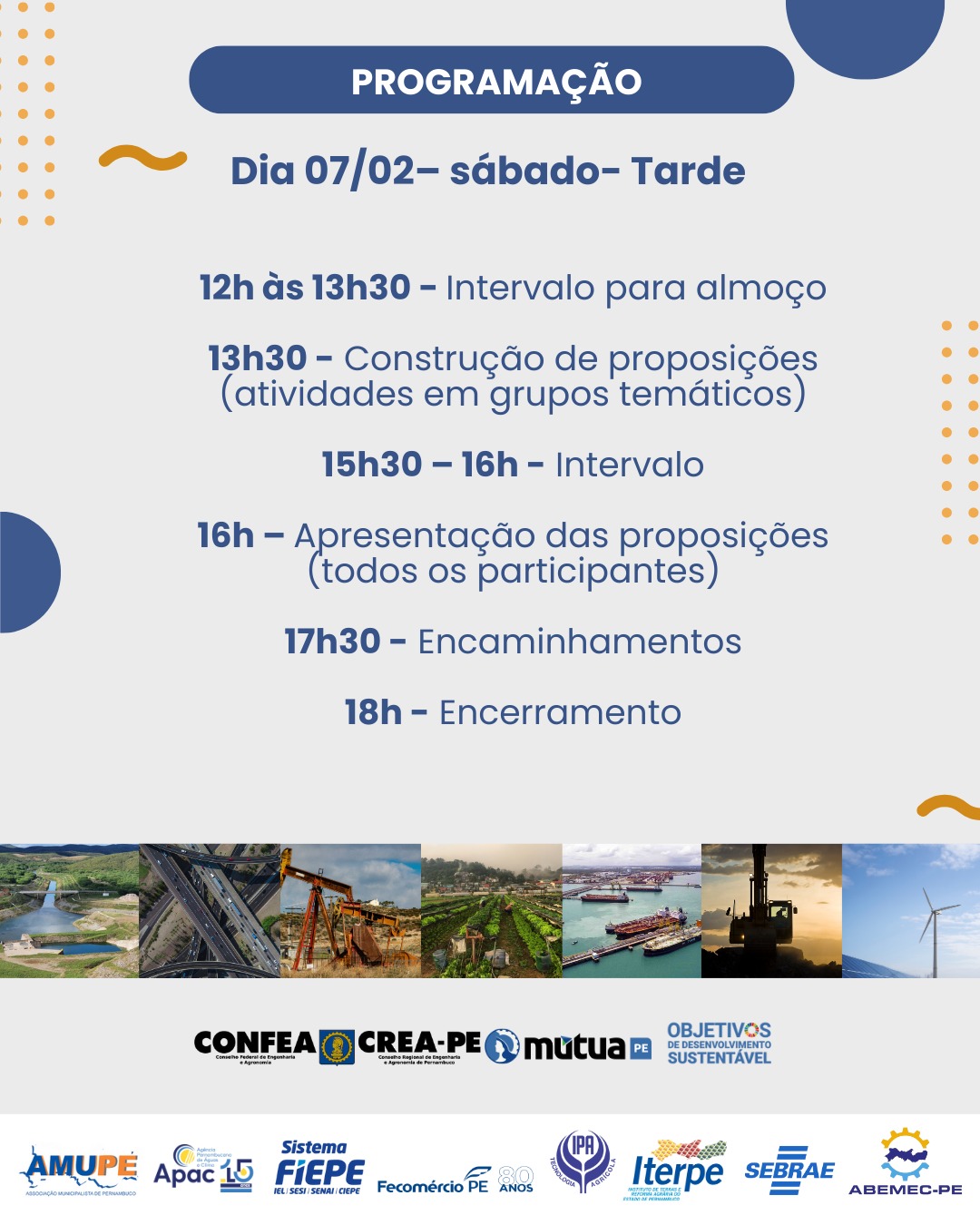 No sábado, a programação será retomada, às 8h30, com palestra do diretor do Confea, Nielsen Christianni, que fala sobre “Oportunidades e desafios para a sustentabilidade no Complexo Portuário de Suape”. Na sequência, Cezar Andrade, economista da Federação das Indústrias de Pernambuco (Fiepe), aborda o tema “Contexto, avanços, impactos e desafios do desenvolvimento industrial da região”.