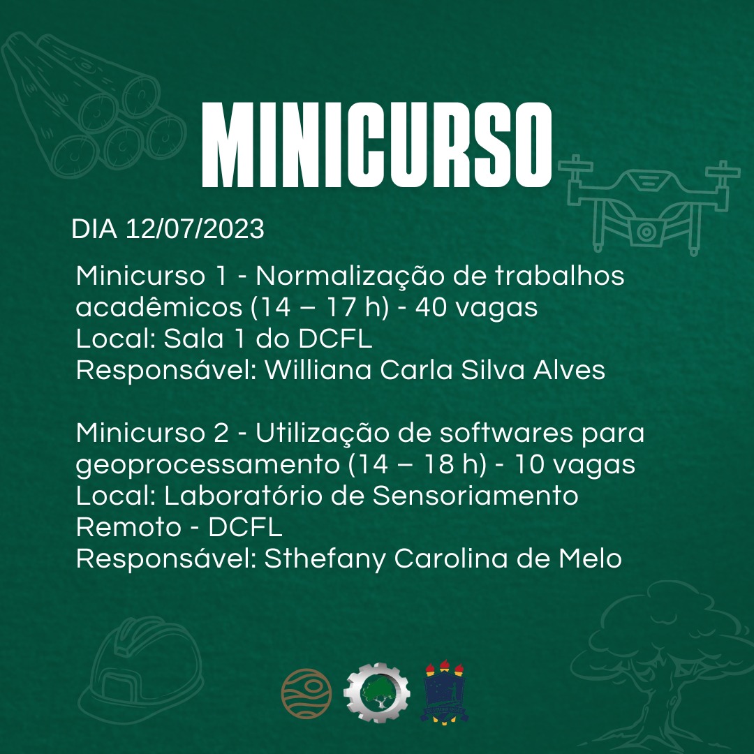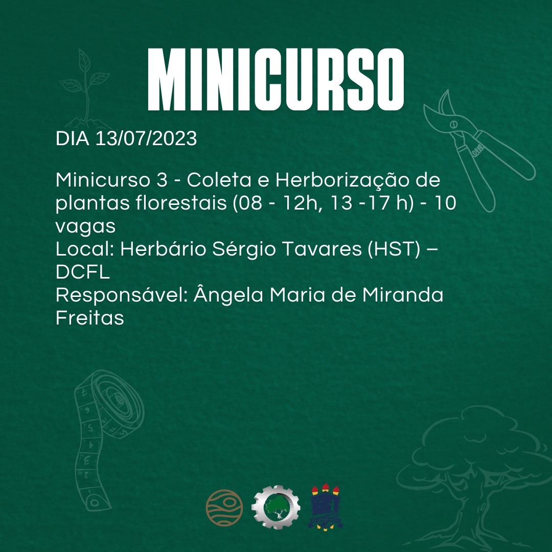 A programação do Dia do Engenheiro Florestal da UFRPE com minicursos ofertados nessa quarta-feira (12) e quinta-feira (13). Confira:
