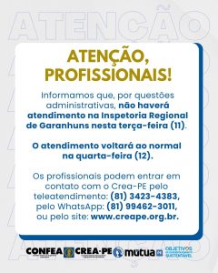 A Inspetoria Regional do Crea-PE no município de Garanhuns não funcionará nesta terça-feira, 11 de novembro, devido a questões administrativas.