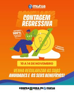 O Crea-PE reforça que, até esta sexta-feira (14), a Mútua-PE está oferecendo condições especiais para regularização de débitos. Esta é a oportunidade para os profissionais colocarem suas pendências em dia e garantirem o acesso a todos os benefícios, vantagens e oportunidades oferecidos pela Caixa de Assistência aos mutualistas.