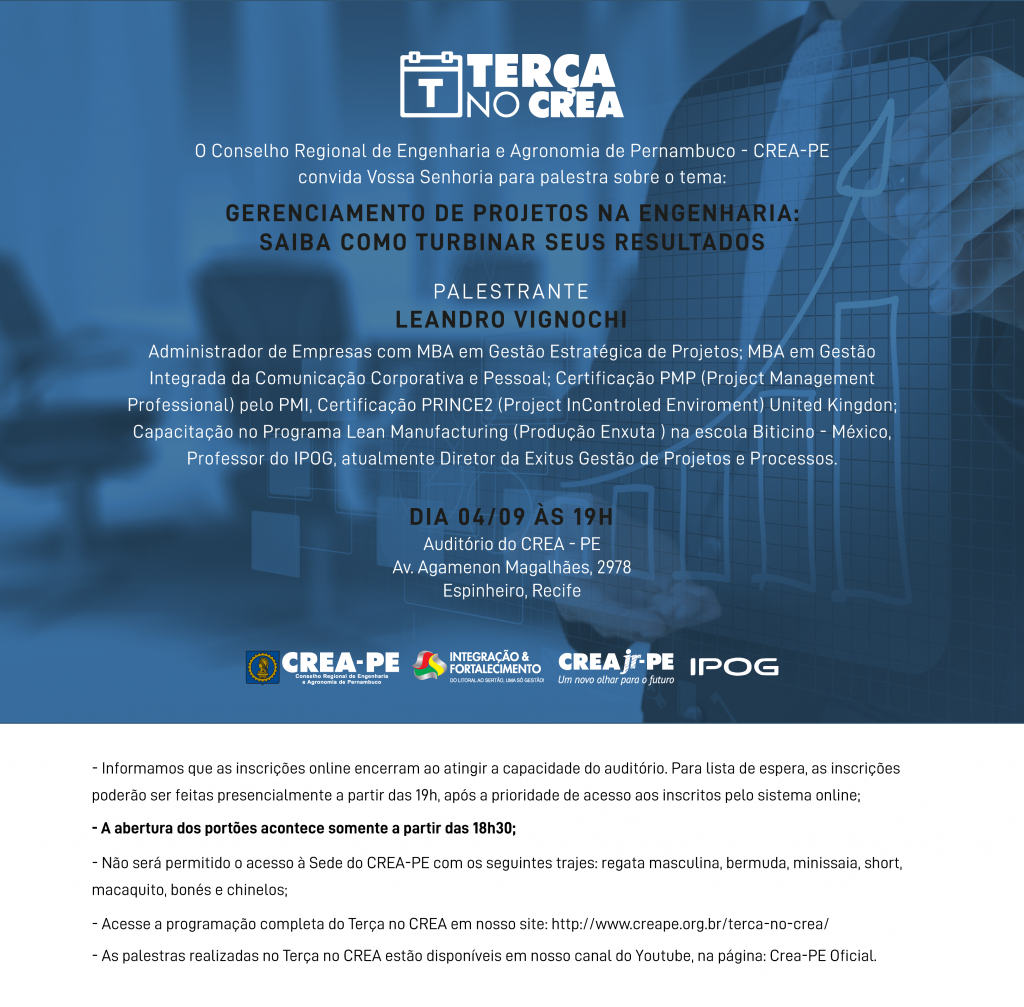 Com vasto campo de informações importantes a serem conhecidas pelos profissionais das áreas tecnológicas, o tema Gerenciamento de Projetos volta a ser abordado no Terça no Crea da próxima semana. Assunto de grande complexidade no que se refere à aplicação e ao acompanhamento, o processo de “Gerenciamento de Projetos na Engenharia: saiba como turbinar seus resultados”, será explicado pelo professor do Instituto de Pós –gradução (Ipog) e administrador de empresas com MBA em Gestão Estratégica de Projetos, Leandro Vignochi.