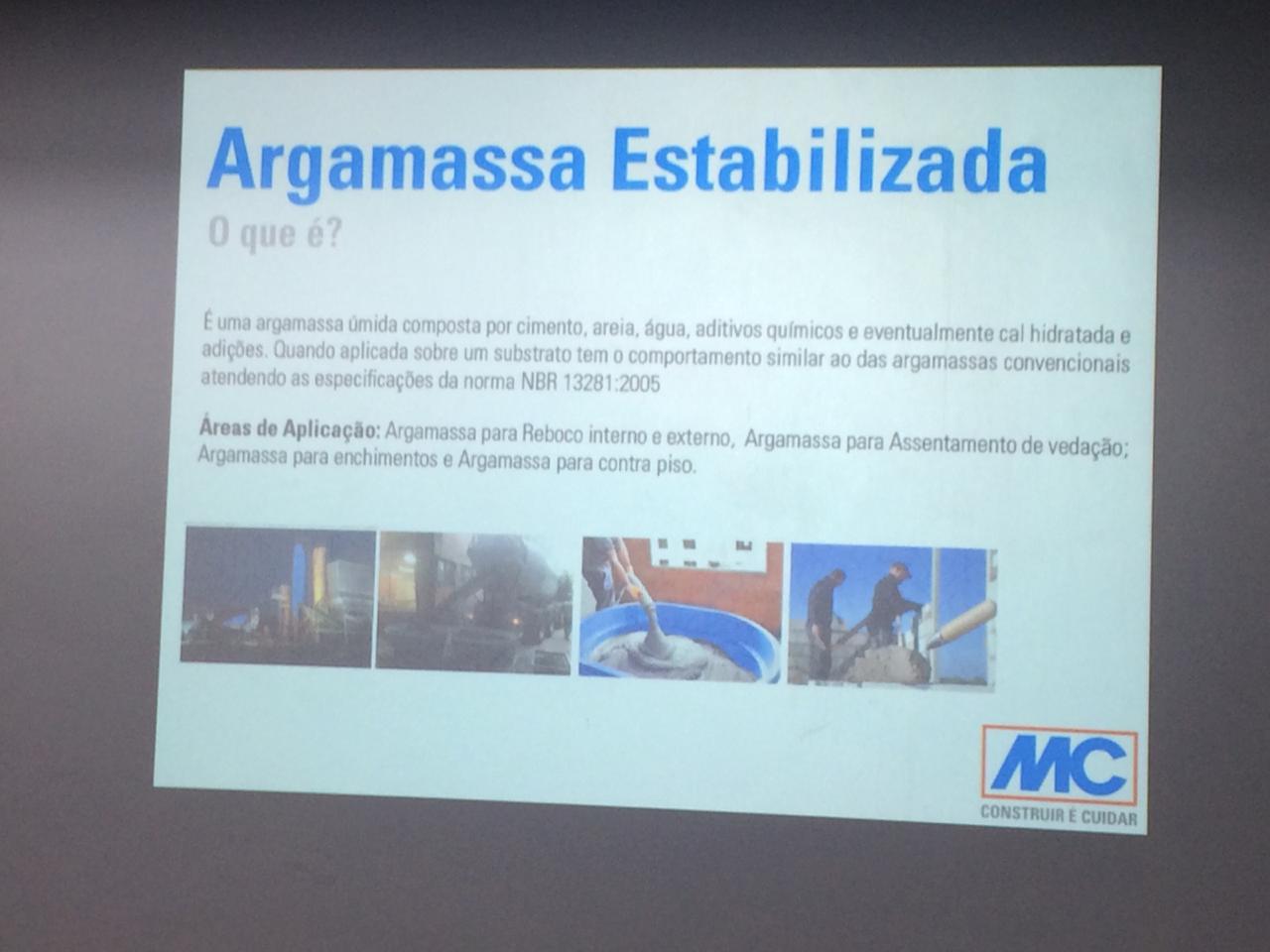 Segundo o professor Cláudio Teles, primeiro palestrante da noite, a superioridade da argamassa estabilizada, está desde sua composição, hoje formada por cimento, areia, água e aditivos especiais, este último componente responsável por manter sua caraterística em estado fresco por longos períodos (até 72 horas). Com isso é possível uma melhor logística de atendimento e aplicação na obra, proporcionando mais economia, agilidade e qualidade.
