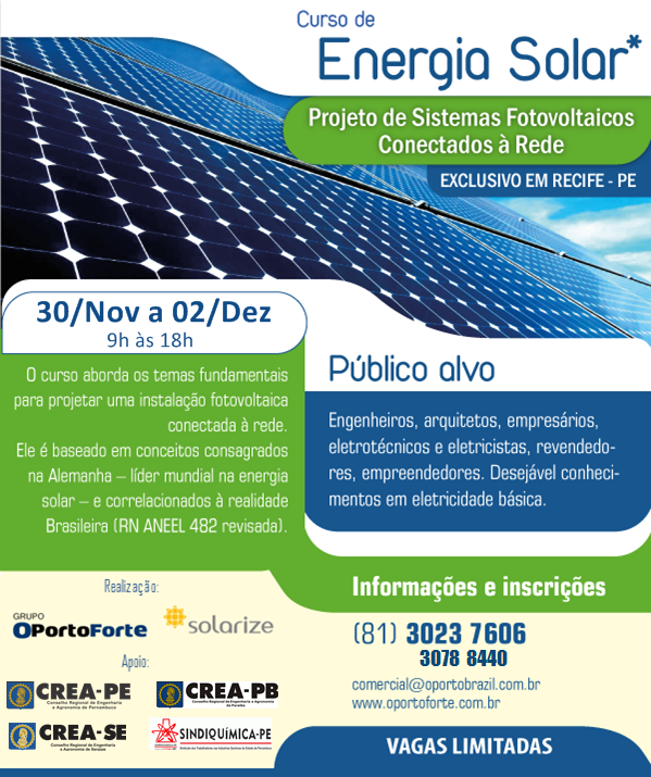 O Porto Brazil, empresa do Grupo OPortoForte realiza, com apoio do Conselho Regional de Engenharia e Agronomia de Pernambuco (CREA-PE), de 30 de novembro a 02 de dezembro de 2017, na sede da instituição, localizada em Jaboatão dos Guararapes, o curso de Energia Solar – Projetos Conectados à Rede. Profissionais registrados no CREA-PE terão 15% de desconto no valor do investimento.