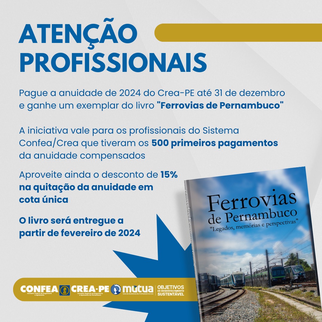 Os profissionais registrados no Conselho Regional de Engenharia e Agronomia de Pernambuco que anteciparem o pagamento da anuidade de 2024, quitando o valor até de dezembro de 2023, além de serem beneficiados com o desconto de 15% sobre o valor da cota única, também terá garantido um exemplar do livro Ferrovias de Pernambuco, publicação realizada pela ABENC-PE com patrocínio do Crea-PE. A entrega do livro para os profissionais contemplados ocorrerá a partir de fevereiro.