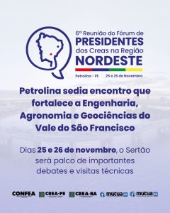Pela primeira vez, o evento acontece na divisa de dois importantes estados nordestinos: Pernambuco e Bahia. Na pauta, medidas estratégicas para o Nordeste, com a troca de experiências e o debate qualificado entre os presidentes para fortalecer as ações dos Creas e contribuir para a construção de soluções mais eficazes para a Engenharia, Agronomia e Geociências, com impactos positivos para o desenvolvimento econômico, social e sustentável.