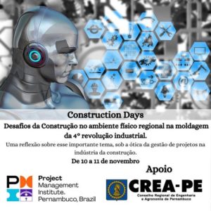 Nos dias 10 e 11 de novembro, o PMI-PE promoverá evento com o objetivo de discutir os “Desafios da construção no ambiente físico regional” em um contexto de 4ª Revolução Industrial. (Integração do ambiente; modificação do ser humano; reforma do mundo físico e; tecnologias extensíveis).