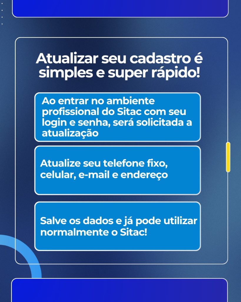 A partir desta segunda-feira (06), todos os profissionais registrados no Crea-PE terão que fazer a atualização cadastral no ambiente profissional do Sitac. A solicitação para atualizar os dados será automática, assim que o profissional entrar na plataforma, com seu login e senha. É simples, fácil e rápido. Como a atualização é obrigatória, o acesso ao Sitac ficará bloqueado até que os dados sejam confirmados ou alterados.