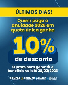 Vantagem para quem se antecipa. Os profissionais registrados no Crea-PE têm até o dia 28 de fevereiro para aproveitar o desconto de 10% no pagamento da anuidade de 2026. O benefício é concedido para quem optar pelo pagamento em quota única até essa data.