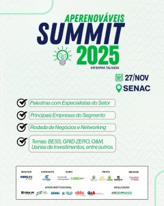 Um grande encontro de especialistas para debater o futuro do setor de energias renováveis em Pernambuco. Na próxima quinta-feira, 27 de novembro, o município de Serra Talhada, no Sertão do Pajeú, será palco do SUMMIT 2025. O evento é uma iniciativa da Associação Pernambucana de Energias Renováveis (APERENOVÁVEIS) e conta com o apoio do Crea-PE.